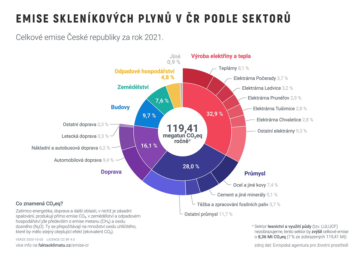 Rozložení celkových emisí skleníkových plynů (v tunách CO₂ ekvivalentu) v ČR za rok 2021 v jednotlivých sektorech lidské činnosti. Roční objem emisí České republiky je 119,41 mil. tun (údaj z roku 2021). V přepočtu na obyvatele to je 11,38 t CO₂eq/obyvatele.